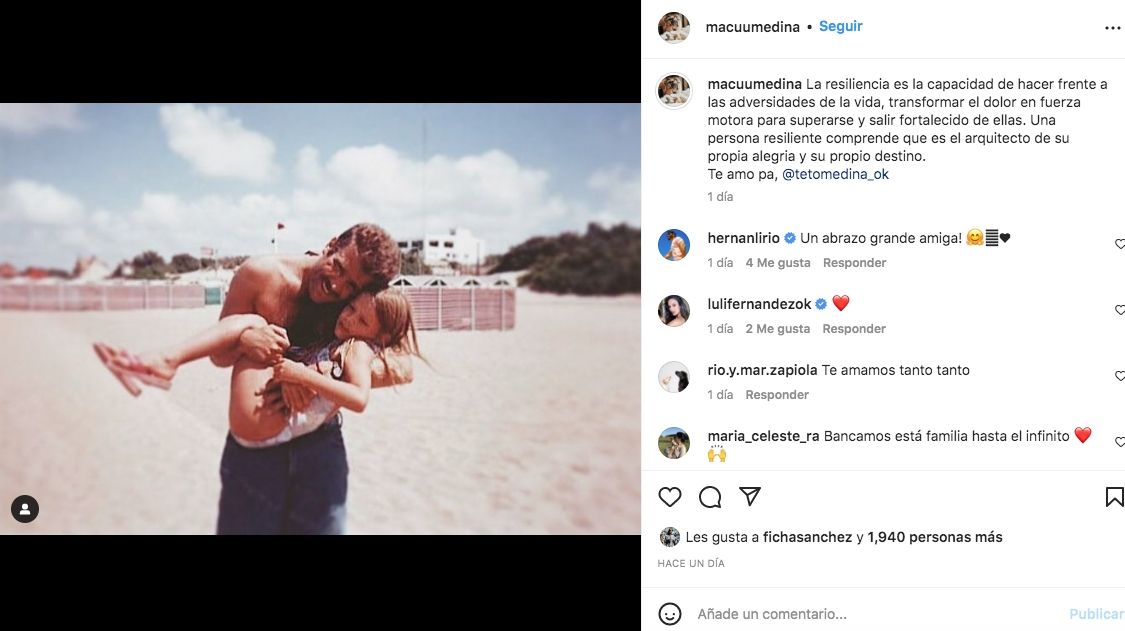 Mientras que su feed, Maca también se refirió a la coyuntura adversa y sensible del ex VideoMatch al redactar una serie de reflexiones muy profundas. “La resiliencia es la capacidad de hacer frente a las adversidades de la vida, transformar el dolor en fuerza motora para superarse y salir fortalecido de ellas. Una persona resiliente comprende que es el arquitecto de su propia alegría y su propio destino. Te amo pa”, aseveró.