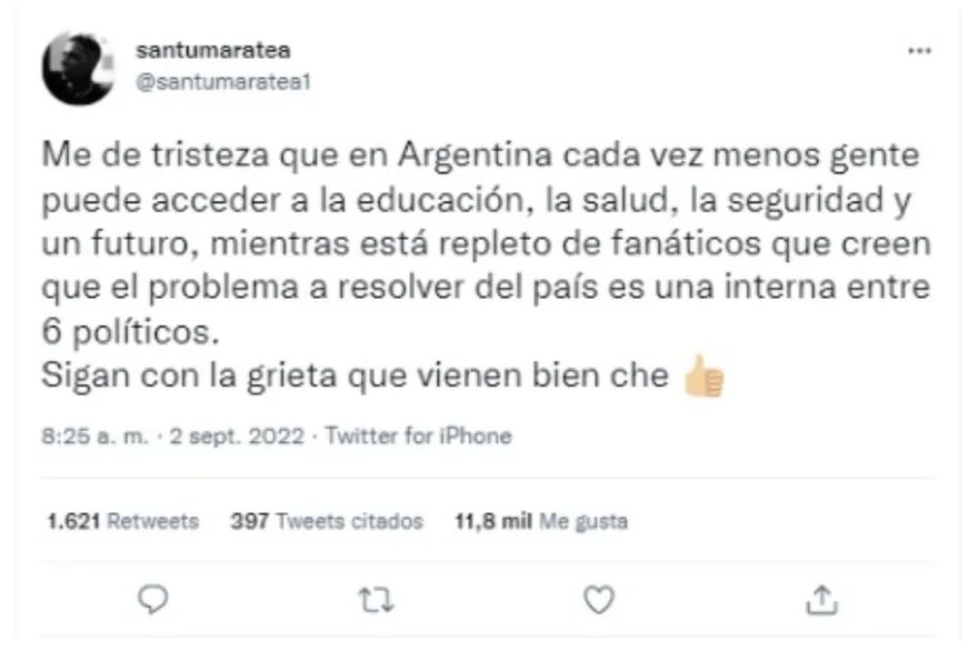 Mientras que otro seguidor repudió a Santi Maratea por no referirse de manera al ataque contra Cristina Fernández de Kirchner. “Santiago, hoy necesitamos repudiar con fuerza la violencia para cuidar los consensos ciudadanos que conseguimos. Es una ilusión creer que no hacés política. La hacés, y en estos casos de la peor manera, minimizando algo gravísimo para la democracia argentina”, interpeló la persona.