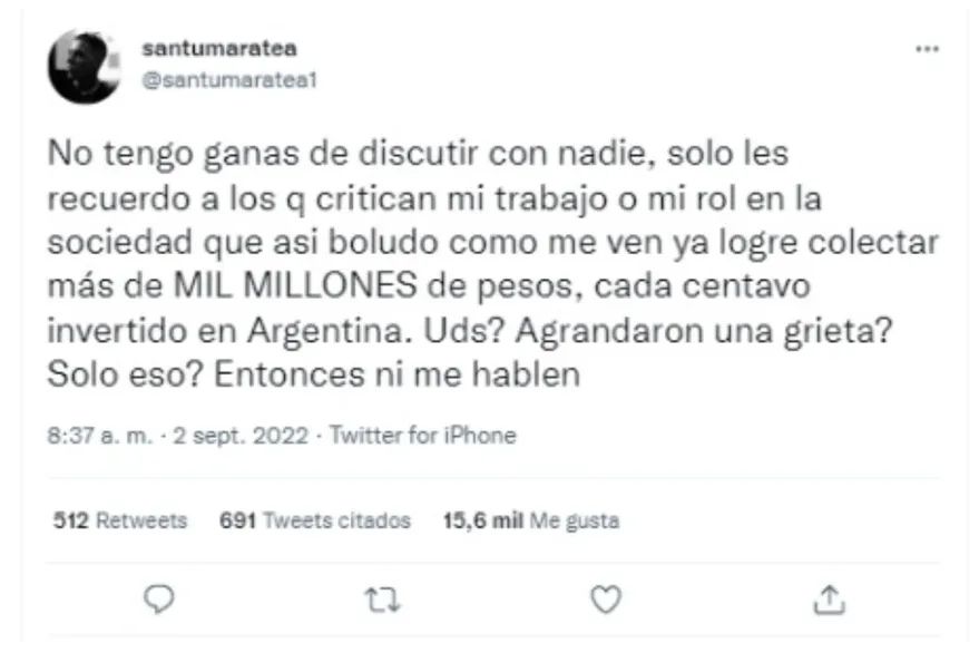 Decepcionado por la reacción a su comentario, Maratea respondió: “No tengo ganas de discutir con nadie, solo les recuerdo a los que critican mi trabajo o mi rol en la sociedad, que así, boludo como me ven, ya logré colectar más de mil millones de pesos, cada centavo invertido en la Argentina. ¿Ustedes? Agrandaron una grieta? ¿Solo eso? Entonces ni me hablen”.