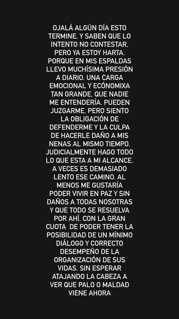 Y finalizó: "Hasta ahora y por varias razones la justicia me dio la razón. Por algo menciono en los mensajes que estoy harta de que me trate mal a mí y también a mi mamá. ¿Atadas mis hijas? Las veo los seres más libres y felices. Las crío así y se les nota por los poros".