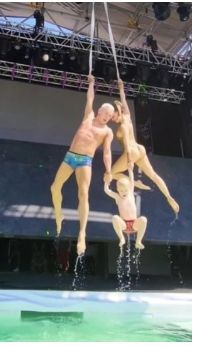 En pleno desarrollo de su nueva apuesta titánica en lo artístico, con esa estructura descomunal que mixtura facetas de toda índole como acrobacia, baile acuático, cuadros de revista y humor, Flavio aprovechó todo ese mundo para jugar con el gurrumino.