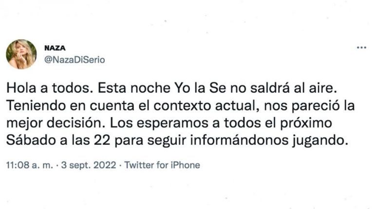 Como si fuera poco, hace algunas horas sorprendió a todos al comunicar la fuerte decisión que tomó sobre su programa a tres semanas de su debut: "Hola a todos. Esta noche Yo lo sé no saldrá al aire. Teniendo en cuenta el contexto actual, nos pareció la mejor decisión".