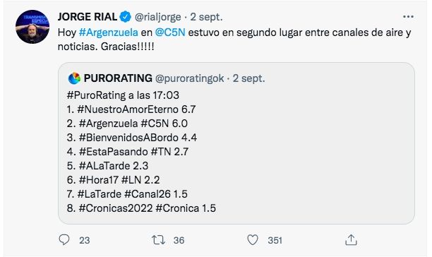 Tras el atentado que sufrió Cristina Fernández el jueves por la noche, Argenzuela, el programa que conduce Jorge Rial por la pantalla de C5N, alcanzó mediciones históricas para el canal. Superando todo tipo de espectativa, el ciclo arrasó en materia de audiencia, superando a El Trece y quedando mano a mano con Telefe.
