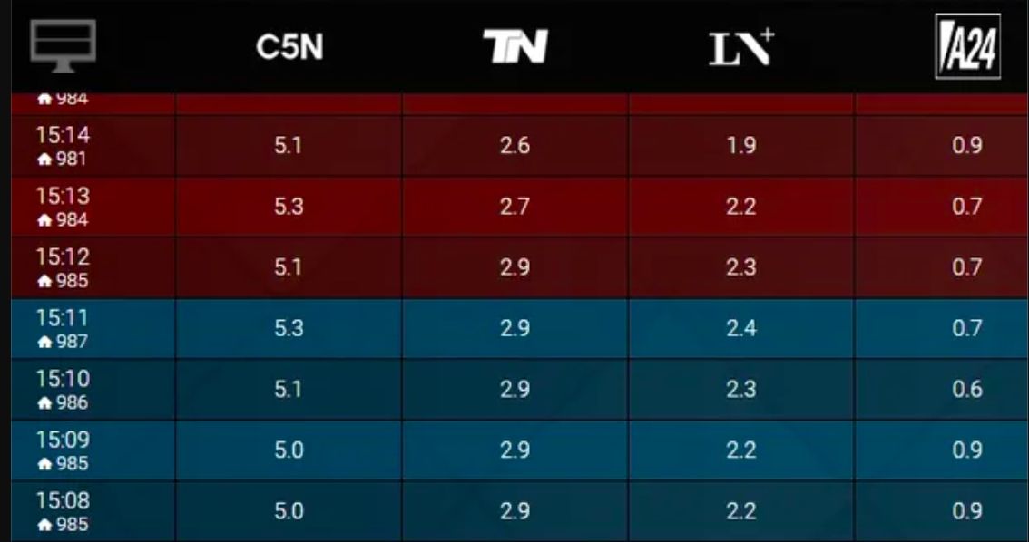 En cuando a la competencia, el segmento de canales de noticias fue para Rial con amplia comodidad. Por momentos duplicó a TN y triplicó al canal La Nación +.