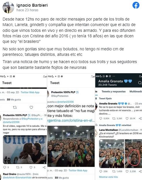 "Desde hace 12hs no paro de recibir mensajes por parte de los trolls de Macri, Larreta, Grindetti y compañia que intentan convencer que el acto de odio que vimos todos en vivo y en directo es armado. Y para eso difunden fotos mías con Cristina del año 2016 (yo tenía 18 años) en las que dicen que soy 'el brasilero'", manifestó.