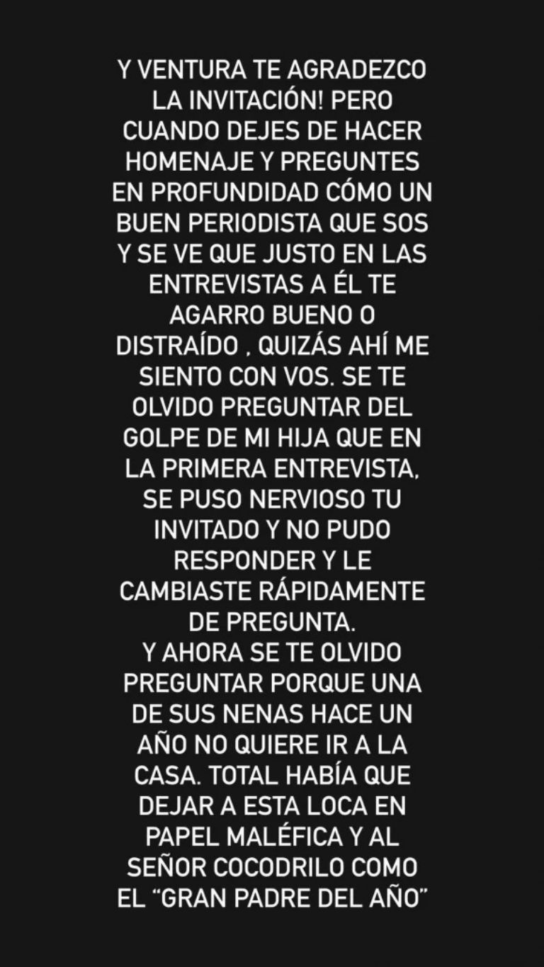 Luego de la visita de Matías al piso de Secretos verdaderos, la famosa no tardó en armar una storie con un extenso texto y bramó: “Tampoco fuiste muy incisivo con la pregunta sobre la cuota alimentaria. Ventura ojala preguntes en profundidad como un buen periodista que sos y se ve que justo en las entrevistas a él te agarró bueno o distraído”.