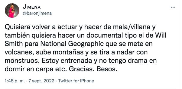 "Quisiera volver a actuar y hacer de mala/villana y también quisiera hacer un documental tipo el de Will Smith para National Geographic que se mete en volcanes, sube montañas y se tira a nadar con monstruos. Estoy entrenada y no tengo drama en dormir en carpa etc. Gracias. Besos", posteó fiel a su estilo.