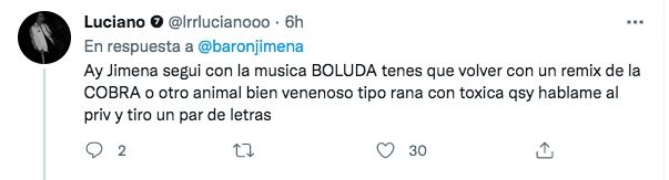 Como era de esperarse, la reacción de sus seguidores no se hizo esperar. "Ay Jimena seguí con la música BOLU** tenés que volver con un remix de la Cobra o otro animal bien venenoso tipo rana con tóxica... hablame al privado y tiro un par de letras", comentó un usuario.