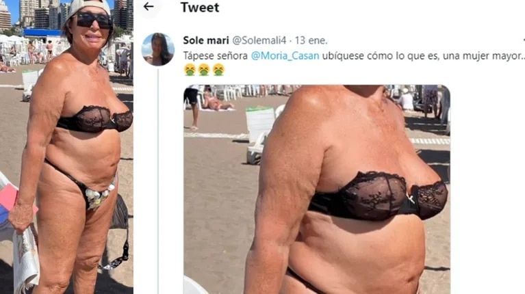 "Tápese, señora, ubiquese como lo que es, una mujer mayor", fue el mensaje que dejó el usuario Sole Mari en Twitter junto a una foto de Moria Casán en bikini.