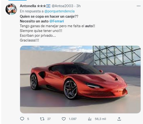 "¿Quién se copa en hacer un canje? Necesito un auto Ferrari. Tengo ganas de manejarlo pero me falta el auto. Siempre quise tener uno. Escriban por privado", expresó con ironía otro usuario.