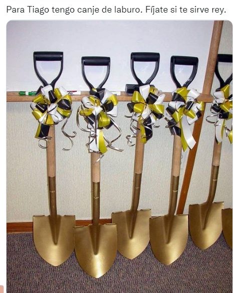 "Para Tiago tengo canje de laburo. Fijate si te sirve rey", escribió un tuitero y compartió una foto con seis palas, dando a entender que el último eliminado debería conseguirse un trabajo.