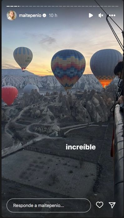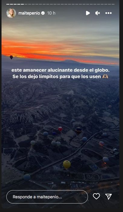 En otra storie, Maite aseguró: “Este amanecer alucinante desde el globo, se los dejó para que lo usen”. Mientras que agradeció a su familiar por la idea: “Gracias Andrea por haber flasheado con este regalo maravilloso para tu cumpleaños de cincuenta”.