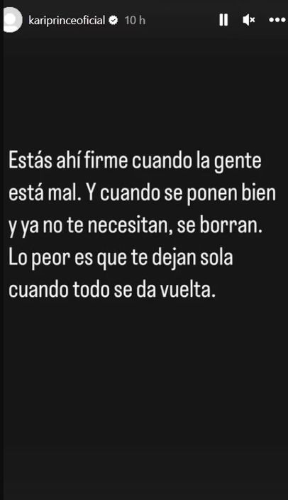 Ahora, la cantante continuó haciendo catarsis en las redes sociales. "Estás ahí firme cuando la gente está mal. Y cuando se ponen bien y ya no te necesitan, se borran. Lo peor es que te dejan sola cuando todo se da vuelta".