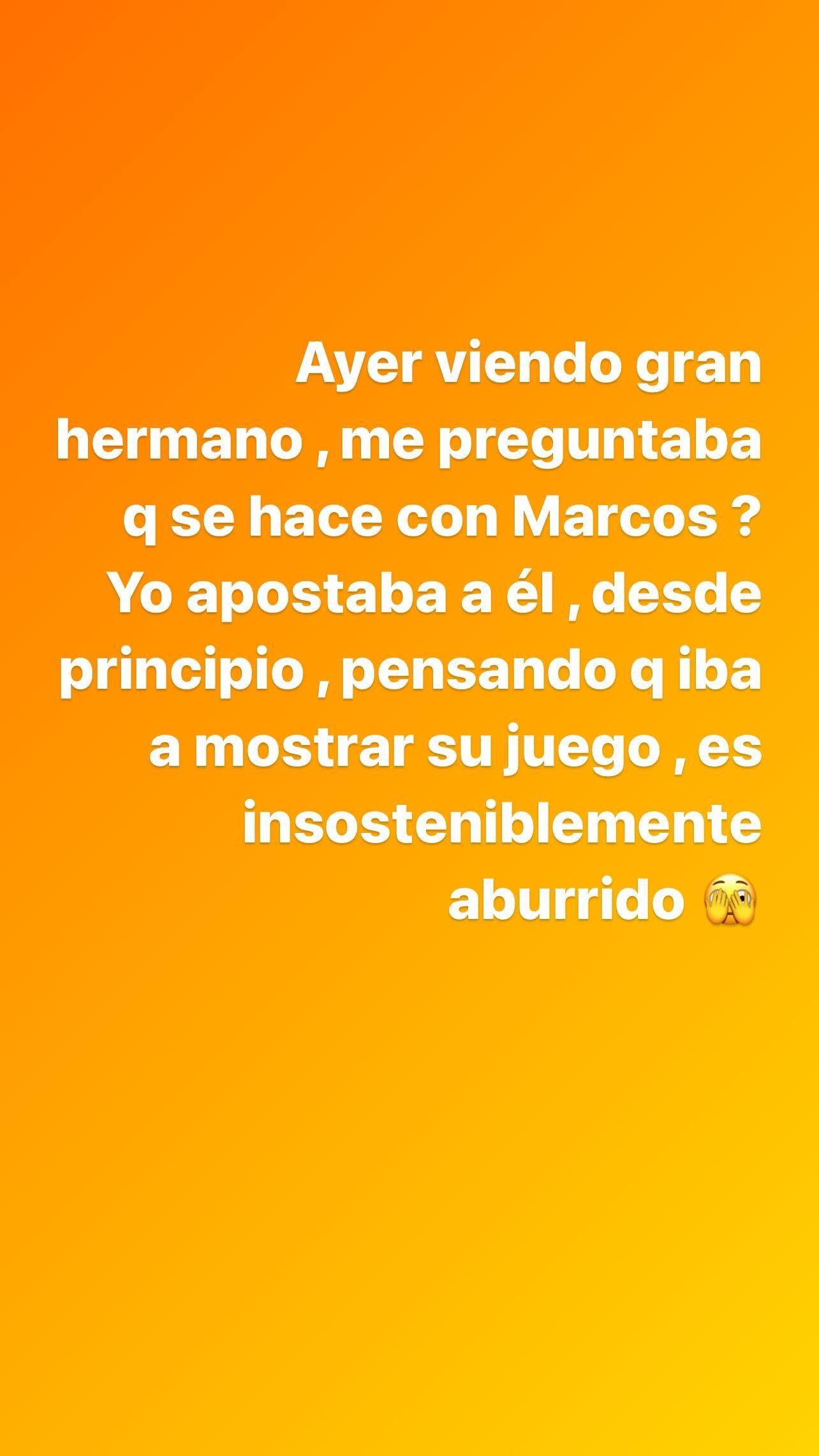 Desde sus historias de Instagram, este martes Marianela Mirra apuntó contra Marcos, el concursante conocido por el sobrenombre de "Primo". “Ayer viendo Gran Hermano me preguntaba: ¿Qué se hace con Marcos? Yo apostaba a él, desde el principio, pensando que iba a mostrar su juego. Pero es insosteniblemente aburrido”, disparó sobre el favorito de los seguidores de Gran Hermano.