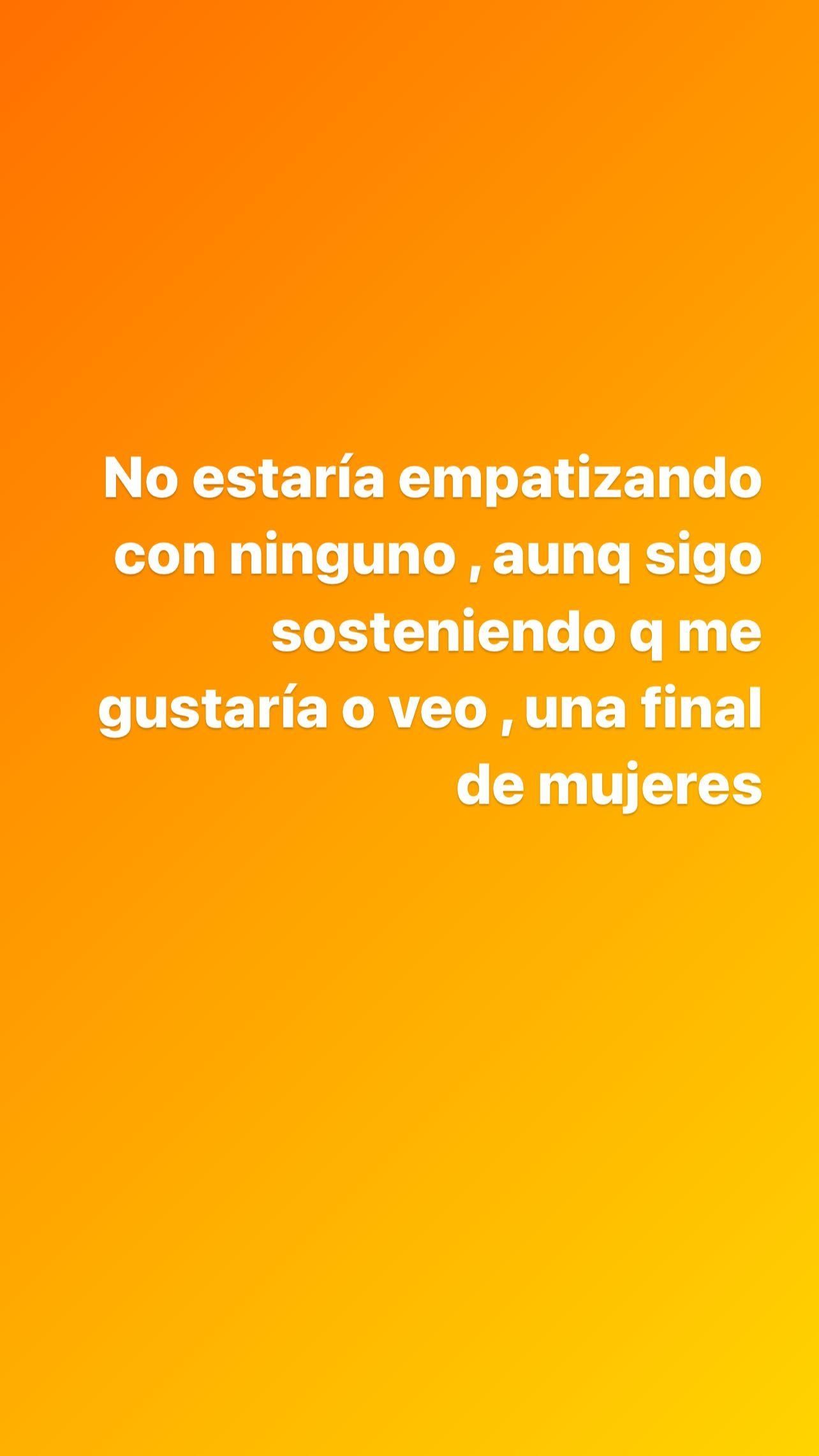 Luego, Marianela Mirra aseguró: “No estaría empatizando con ninguno. Aunque sigo sosteniendo que me gustaría una final con mujeres”.Aunque se atrevió a vaticinar: “Como va la cosa, creo que Juli, Romi y Daniela tienen asegurada la final. Y me importa una pi... sus insultos”.