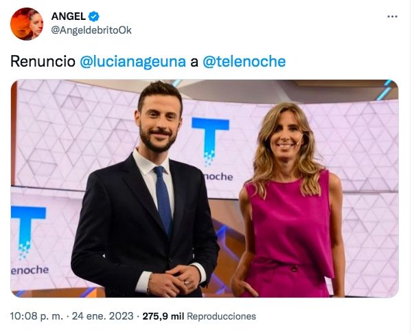 La noticia fue revelada por Ángel de Brito. "Renunció @lucianageuna a Telenoche", reveló el conductor de LAM (América TV) en su cuenta de Twitter.