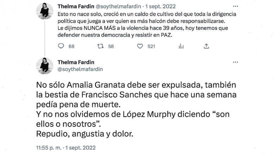 Además, la actriz arremetió contra Amalia Granata y algunos referentes de la escena política por sus dichos sobre el atentado. "No sólo Amalia Granata debe ser expulsada, también la bestia de Francisco Sanches que hace una semana pedía pena de muerte. Y no nos olvidemos de López Murphy diciendo “son ellos o nosotros”. Repudio, angustia y dolor", escribió en otro mensaje Thelma Fardin.