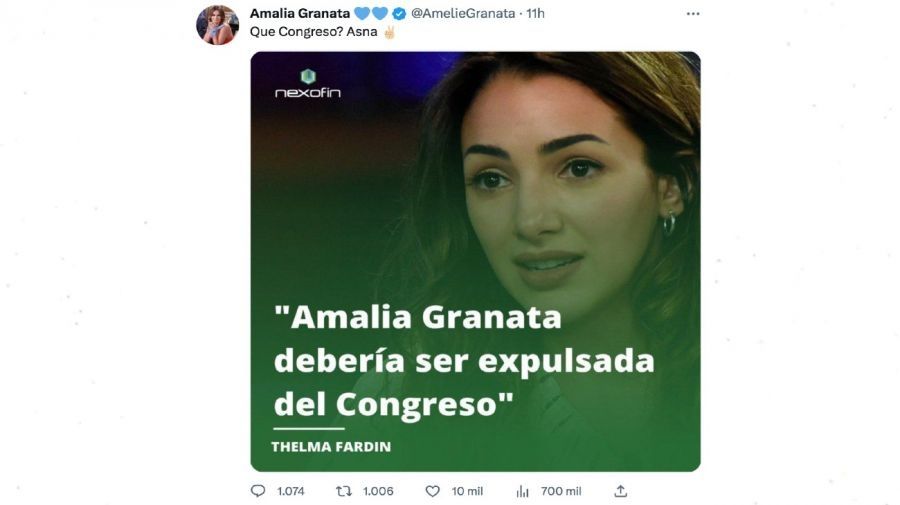 "Amalia Granata debería ser expulsada de Congreso", dice la imagen que Amalia Granata compartió atribuyéndosela a Thelma Fardin. Con intención de desacreditar a la actriz, ya que su espacio de trabajo es la Cámara de Diputados, la funcionaria retrucó: "¿Qué Congreso? Asna".