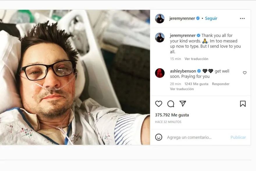El popular actor atravesó este alarmante episodio el domingo pasado mientras operaba su máquina quitanieve. En la imagen de la publicación que Jeremy Renner subió a su cuenta de Instagram se lo puede ver con heridas en su rostro, y asistencia de oxígeno.