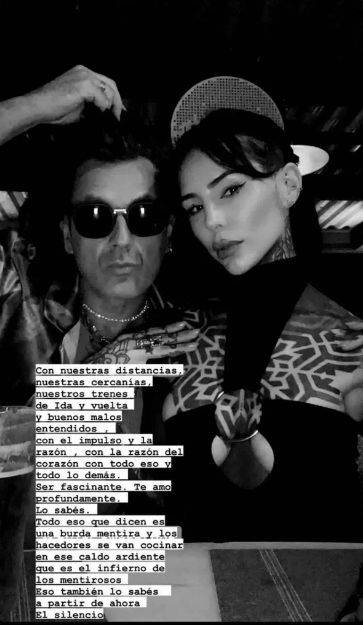 "Con nuestras distancias, nuestras cercanías, nuestros trenes de ida y vuelta y buenos y malos entendidos, con el impulso y la razón, con la razón del corazón, con todo eso y todo lo demás. Ser fascinante, te amo profundamente, lo sabés", manifestó el artista, junto a una imagen junto a la hija del conductor, dejando en claro que para él aún no está todo perdido.