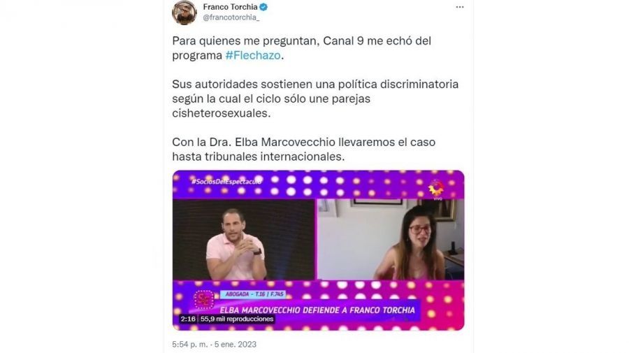 Para despejar todo tipo de dudas, desde sus redes sociales, Franco Torchia anunció: “Para quienes me preguntan, Canal 9 me echó del programa Flechazo. Sus autoridades sostienen una política discriminatoria según la cual el ciclo sólo une parejas cisheterosexuales. Con la Dra. Elba Marcovecchio llevaremos el caso hasta tribunales internacionales”.
