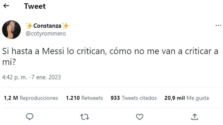 Desde su cuenta de Twitter, la exintegrante de Gran Hermano publicó un comentario en el que no tuvo problema en homologarse a Lionel Messi, y automáticamente recibió una lluvia de comentarios. “Si hasta a Messi lo critican, ¿cómo no me van a criticar a mí?”, escribió Coti.