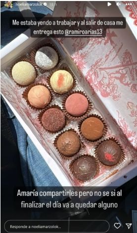 Ramiro Airas le obsequió a Noelia Marzol una preciosa caja de trufas de la marca top de chocolates Vasalissa que, además de ser riquísimos, son muy bellos. En esta oportunidad, eligió manjares dulces de chocolate negro y blanco rellenos; decorados con polvitos y granas de colores.