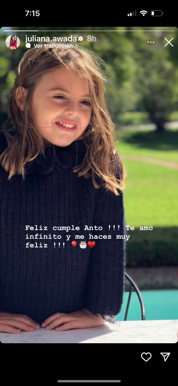 Con una foto de Antonia, Juliana Awada le dedicó una historia acompañada de: “Feliz cumple Anto. Te amo infinito y me haces muy feliz”.