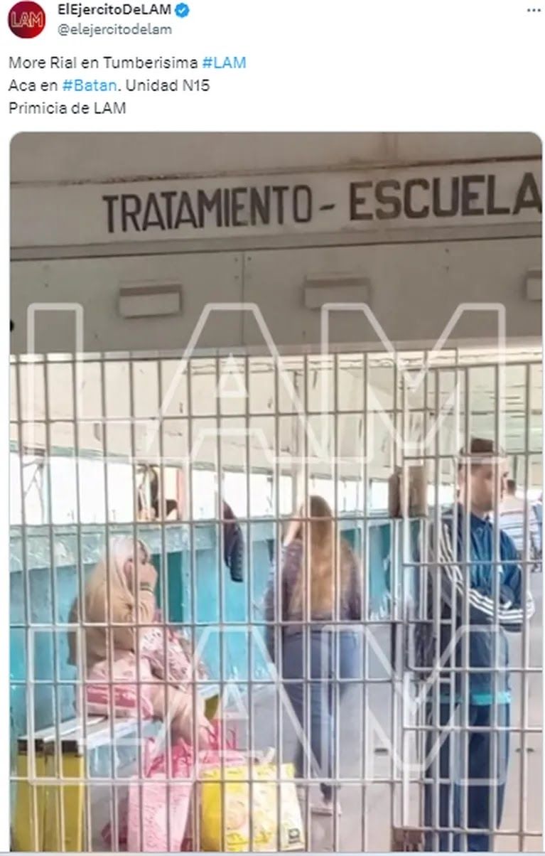 Desde LAM fueron más allá y dieron con una imagen que registra a la hija de Jorge Rial dentro de la cárcel, sentada en un espacio común al aire libre junto a diferentes pertenencias y aprovecharon para dejar una elocuente título: "More Rial en tumberísima. Acá en Batán. Unidad N°15".