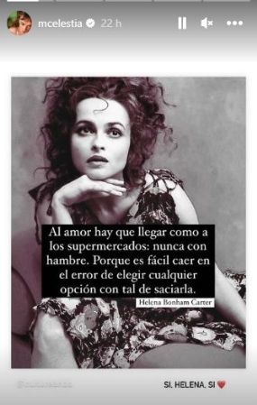 En las últimas horas, subió a su una historia de Instagram una frase de Helena Bonham Carter que versa lo siguiente: "Al amor hay que llegar como a los supermercados: Nunca con hambre. Porque es fácil caer en el error de elegir cualquier opción con tal de saciarla".