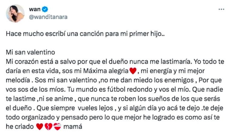 En mayo de este año comenzó a circular el fuerte rumor de que Wanda Nara estaría pensando seriamente en lanzarse como cantante. Luego, la mismísima mediática compartió en sus redes sociales una letra de una canción escrita por ella. La composición está dedicada a su hijo mayor, Valentino. El título que eligió fue "Mi San Valentino".