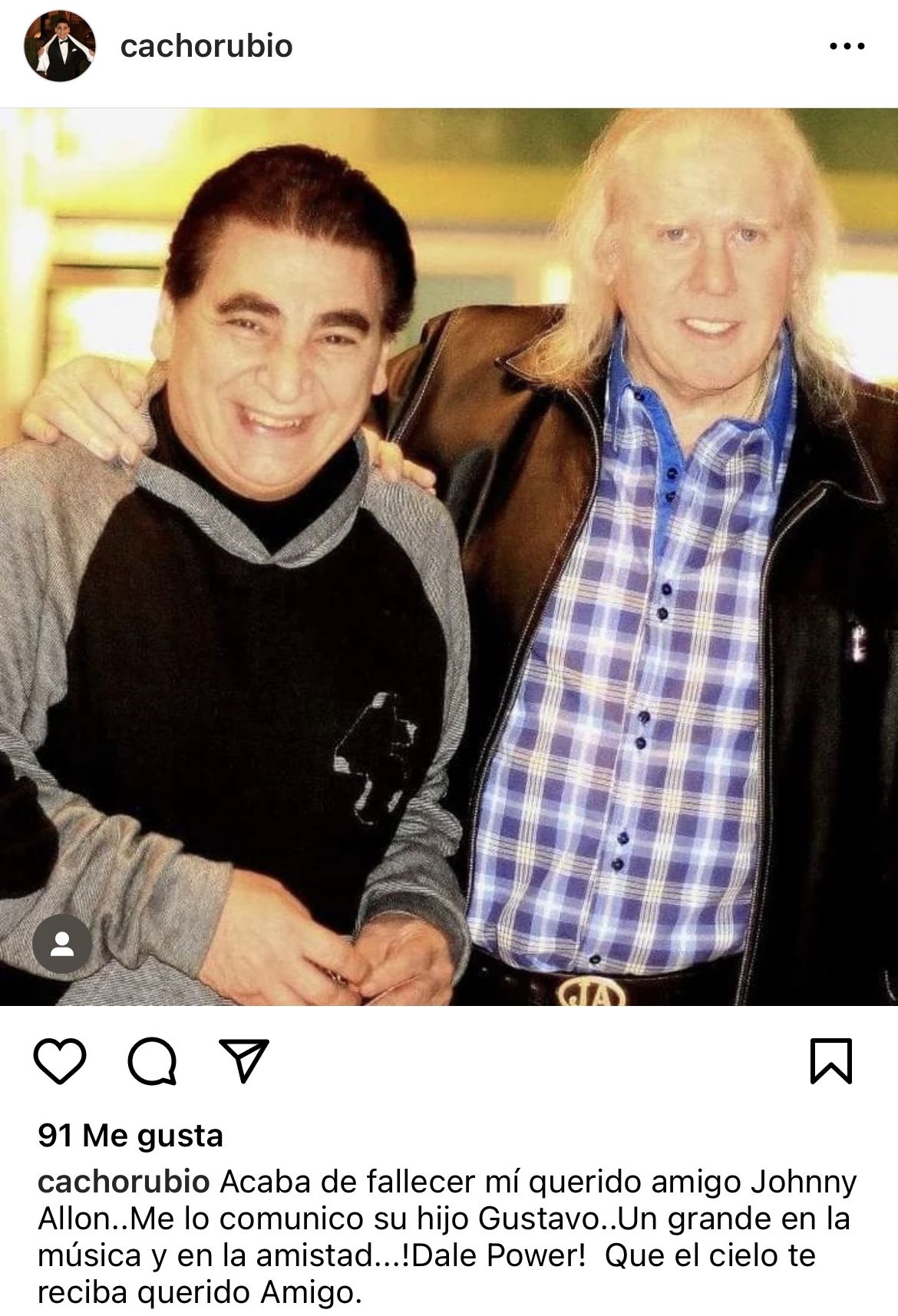 Cacho Rubio, reconocido personaje de la farándula, compartió un posteo en Instagram y escribió: “Acaba de fallecer mí querido amigo Johnny Allon. Me lo comunicó su hijo Gustavo. ¡Un grande en la música y en la amistad! ¡Dale power! Que el cielo te reciba querido amigo”.