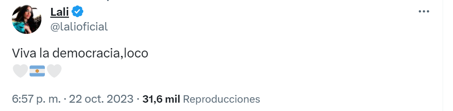 El domingo de las PASO, y desde España, Lali Espósito interactuó con sus seguidores acerca de estas votaciones. "¿Ya votaron, che? Cuenten", escribió la artista en su cuenta de Twitter (X) (@lalioficial).