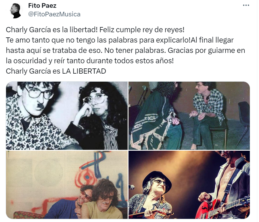 "Charly García es la libertad! Feliz cumpleaños rey de reyes, te amo tanto que no tengo palabras para explicarlo", escribió Fito Páez en un posteo de X (ex Twitter) acompañado de un collage de fotos en las que se los ve juntos en distintas épocas de los últimos cuarenta años.