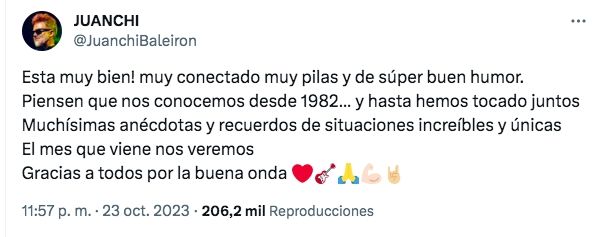 Uno de ellos fue Juanchi Baleirón, guitarrista y cantante de Los Pericos. Ambos se conocen hace más de 40 años y entablaron una amistad que se consolidó con el tiempo. Según relató en sus redes, había retomado el diálogo con el ex líder de V8, Hermética y Almafuerte.