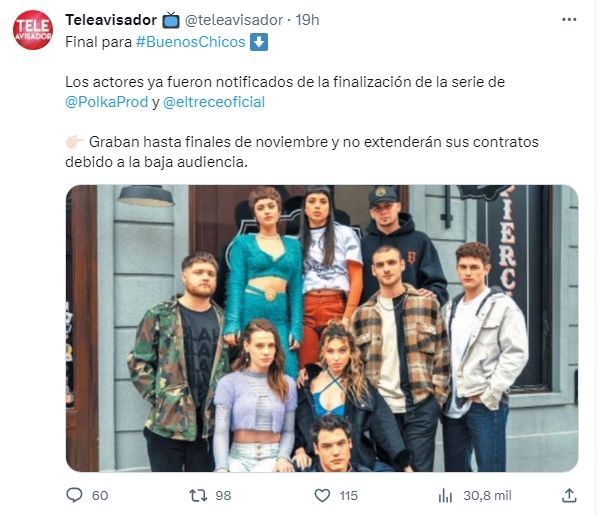 "Graban hasta finales de noviembre y no extenderán sus contratos debido a la baja audiencia", informaron desde la cuenta @teleavisador en Twitter. Claramente Buenos Chicos no cumplió con las expectativas de El Trece, que esperaba otro resultado en materia de audiencia.
