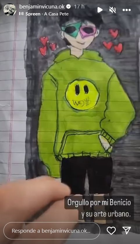 Es que, a sus 9 años recién cumplidos, Benicio se destaca con sus ilustraciones, y así lo demostró el actor chileno al publicar un video en sus historias en el que se lo ve pasando las hojas de una carpeta anillada llena de dibujos realizados con marcadores.
