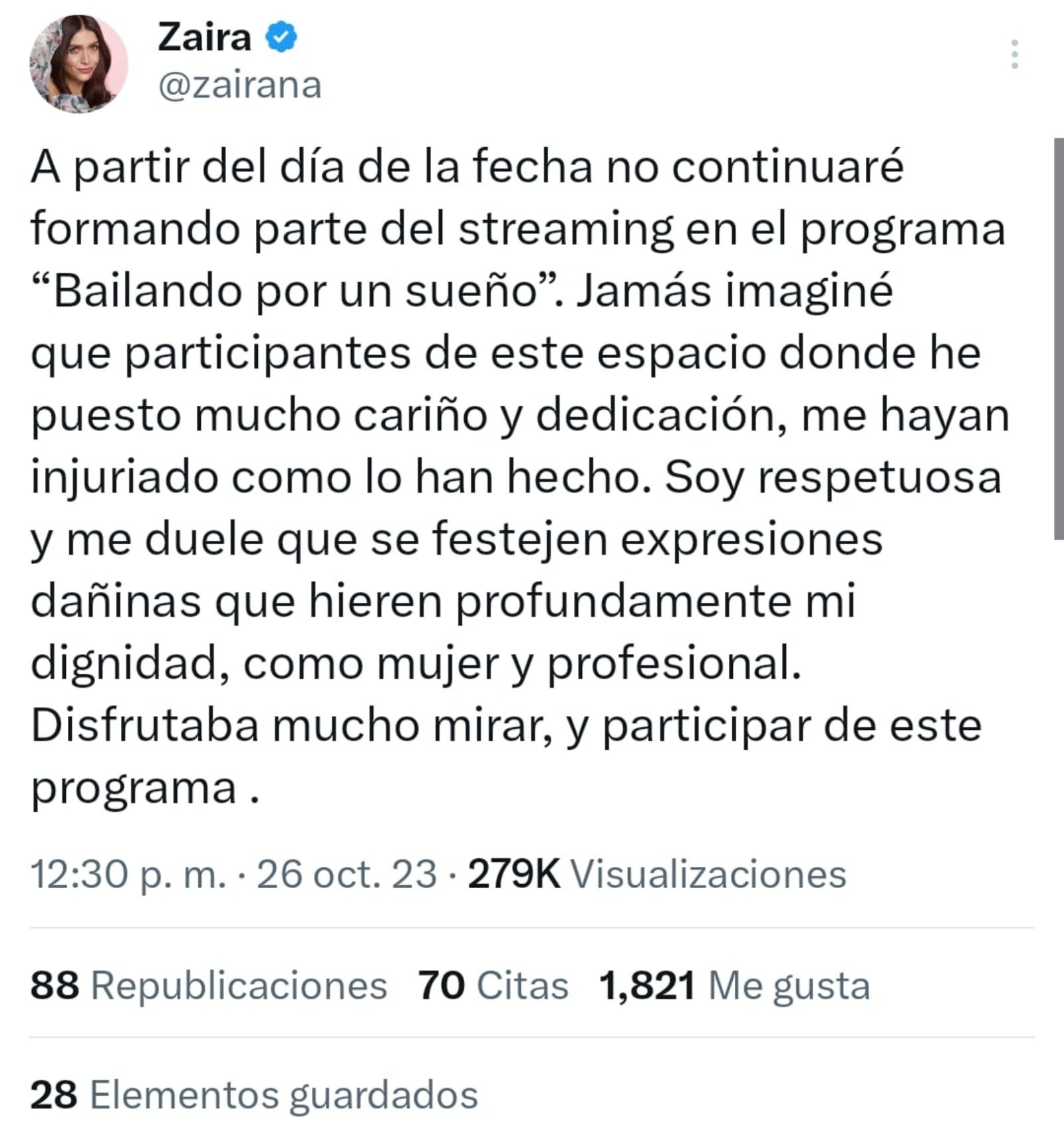 Por los dichos de la joven, Zaira Nara decidió abandonar el programa de Marcelo Tinelli y lo hizo público a través de X (@zairana): "A partir del día de la fecha no continuaré formando parte del streaming en el programa 'Bailando por un sueño'. Jamás imaginé que participantes de este espacio donde he puesto mucho cariño y dedicación, me hayan injuriado como lo han hecho. Soy respetuosa y me duele que se festejen expresiones dañinas que hieren profundamente mi dignidad, como mujer y profesional. Disfrutaba mucho mirar, y participar de este programa". Este mismo comunicado fue compartido en su cuenta de Instagram (@Zaira.nara).
