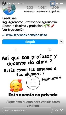 Lo que sucedió fue que Camilia de los Santos subió un video en donde está jugando al futbo y un seguidor disparó: "Salí de ahí amigo. Esa se come una hectárea de porong... cada vez que va a entrenar". A lo que Pablo Granados no se quedó callado y respondió sutilmente: "Que lindos los mensajes que le dejas a mi novia en su muro!", declaró el actor. "Así que sos profesor y docente de alma? Esto le enseñas a tus alumnos?".