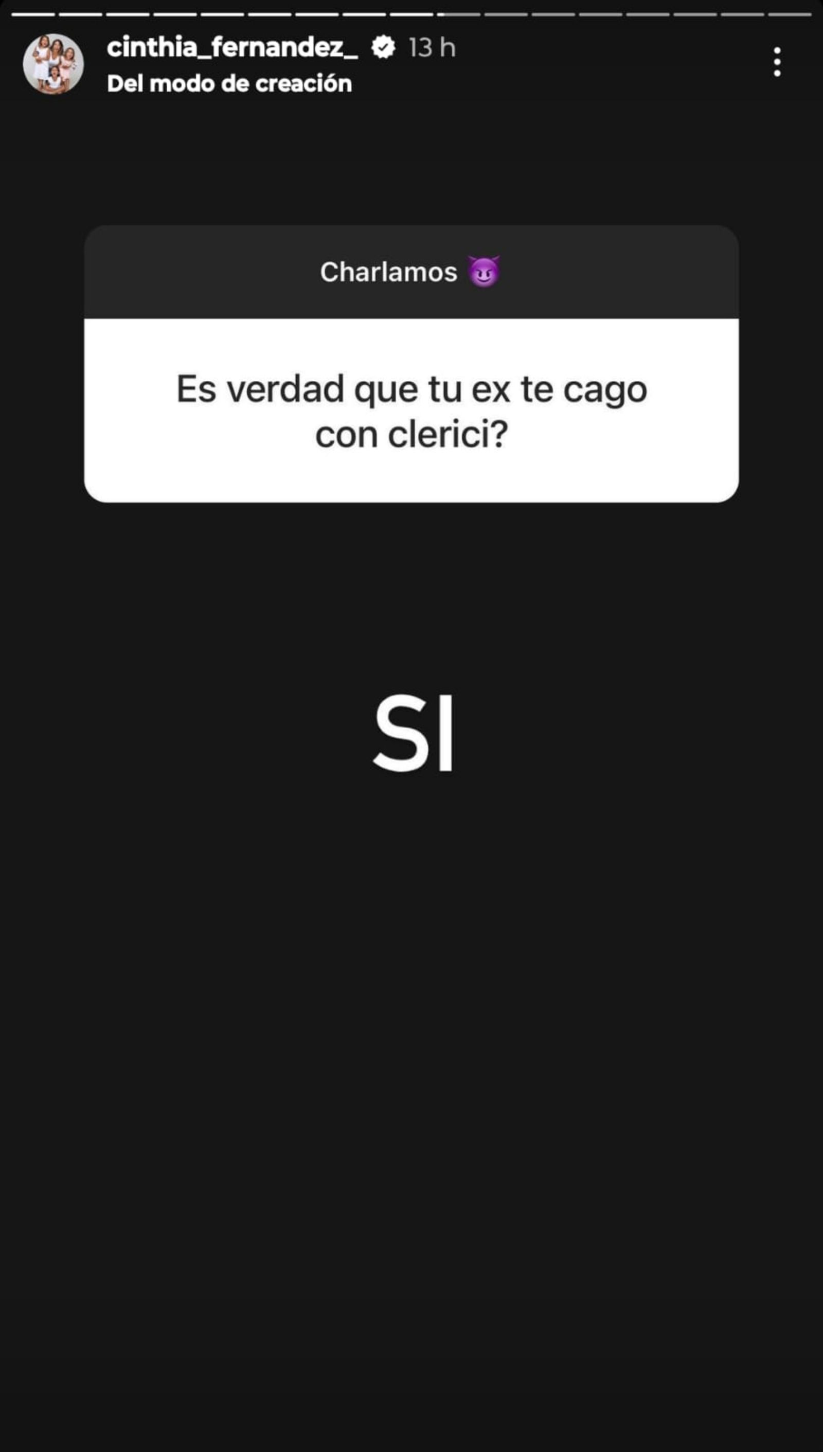 Luego de esa consulta, la bailarina respondió una pregunta que nadie esperaba: "¿Es verdad que tu ex te cagó con Clerici?". "Sí", reveló Cinthia Fernández.