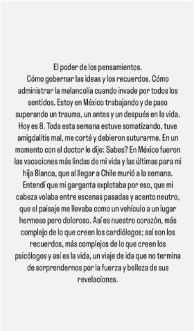 Y luego añadió su revelación con todas las letras: “En un momento con el doctor, le dije ‘¿Sabes? En México fueron las vacaciones más lindas de mi vida y las últimas para mi hija Blanca, que al llegar a Chile murió a la semana”.