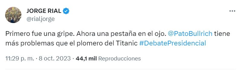 Uno de los más activos en la red de Elon Musk fue Jorge Rial, quien consideró que este debate no tuvo sentido. “Se nota que este segundo debate estaba de más. La actitud conservadora de Sergio Massa y Javier Milei se basa en su seguridad de ya estar en el balotaje. Alguna chicana y nada más. La víctima deseada es Patricia Bullrich y ella entra sola entre los panes que le ponen los dos candidatos”, lanzó.