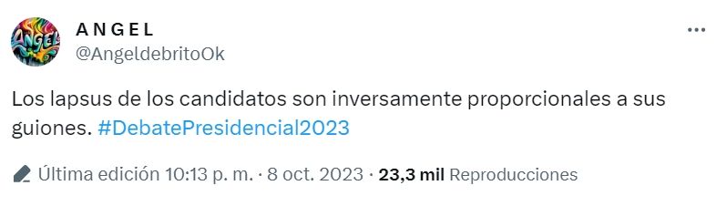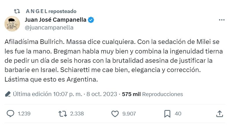 “A Milei lo sacás del ‘conchudo mogólico’ o de la motosierra sin cadena y es esta masa titubeante de frases huecas, contradicciones flagrantes, lentitud mental, gesticulación grotesca y propuestas retrógradas. Massa se expresó con mucha dureza, aunque concentrada en su cara. Bregman y Schiaretti también participaron, agregando la cuota de color. Gran debate. El mejor que he visto”, cerró el cineasta.