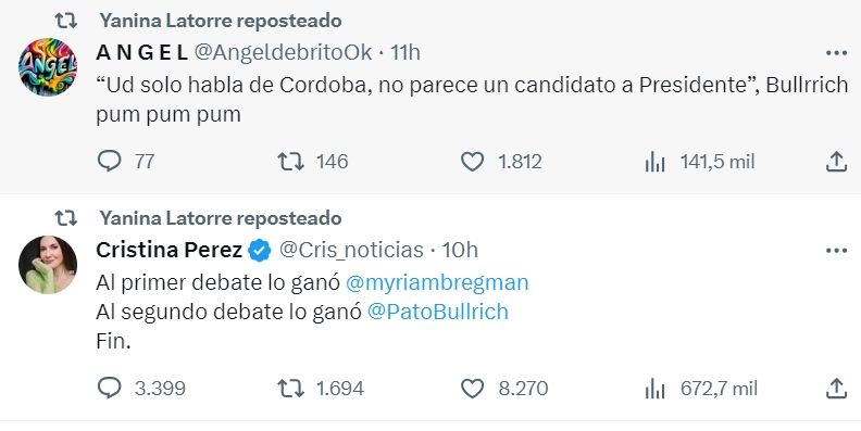 “Hoy Bullrich dejó un manantial de frases y clips para toda la semana. Ganadora del debate sin lugar a dudas y de punta a punta. Clara, rápida, sensata y firme. Tiene que ser ella, no tiene que leer”, indicó.