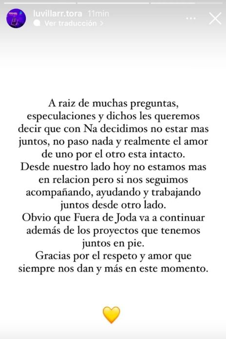 "A raíz de muchas preguntas, especulaciones y dichos les queremos decir que con Na decidimos no estar más juntos, no pasó nada y realmente el amor de uno por el otro está intacto", comenzó.