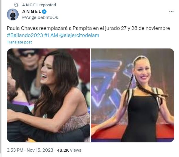 En este contexto, Ángel de Brito reveló quién será la persona que reemplazará a la modelo. "Paula Chaves reemplazará a Pampita el 27 y 28 de noviembre", escribió el periodista en su cuenta de Twitter. Además, adelantó que el programa de Marcelo Tinelli terminará el 31 de enero de 2024.