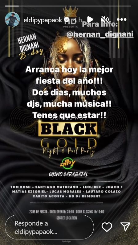 Este domingo El Dipy publicó en sus historias de Instagram el posteo de una fiesta. "Arranca hoy la mejor fiesta del año!! Dos días, muchos djs, mucha música!! Tenés que estar", escribió el músico.