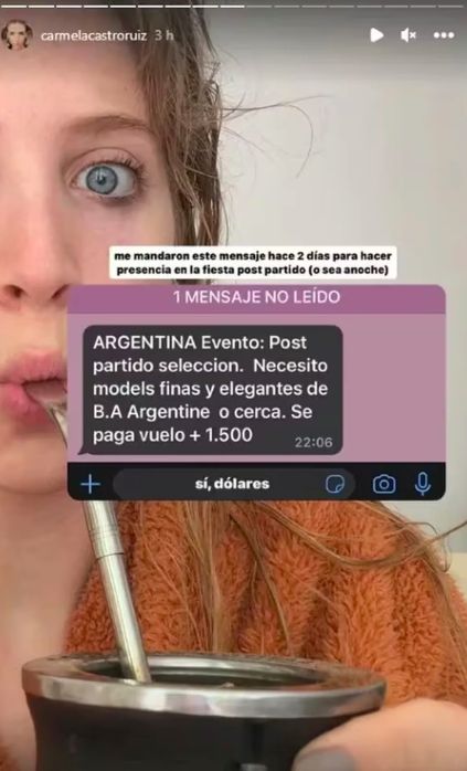 La modelo Carmela Castro Ruiz destapó un verdadero escándalo al compartir en sus redes sociales que recibió una propuesta para formar parte de una fiesta post partido donde estarían presentes varios jugadores de la Selección Argentina.