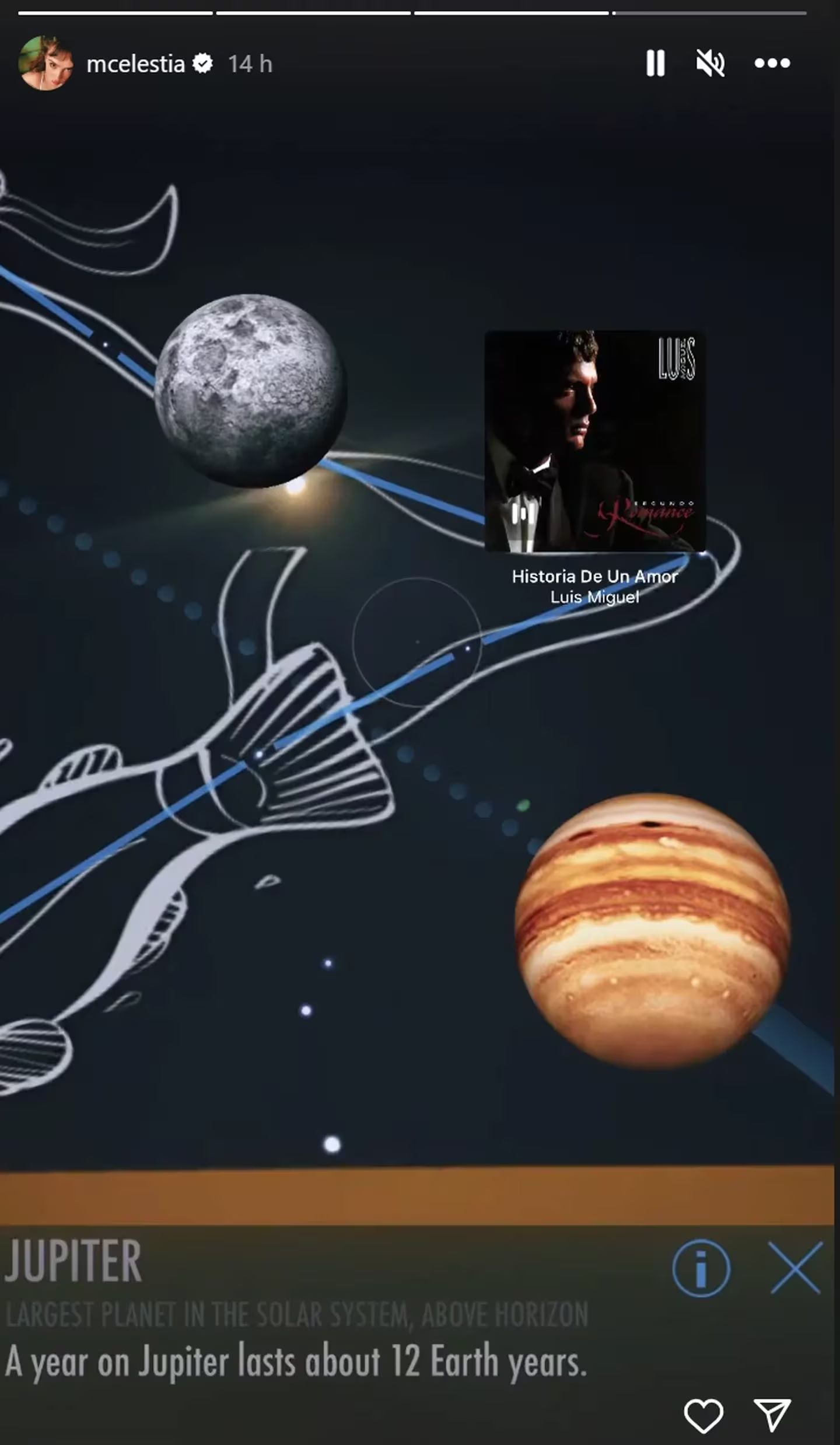 Sin embargo, por estas horas Celeste Cid hizo un llamativo movimiento en su Instagram que no pasó desapercibido. Y es que, en medio de tantas sospechas, compartió el tema Historia de un amor de Luis Miguel junto a una imagen del planeta Júpiter.