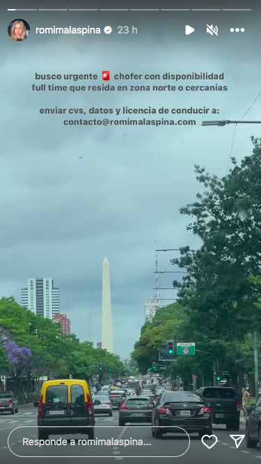 "Busco urgente chofer con disponibilidad full time que resida en zona norte o cercanías. Enviar cvs, datos y licencia de conducir a: [email protected]", informó la rubia en una historia de Instagram.